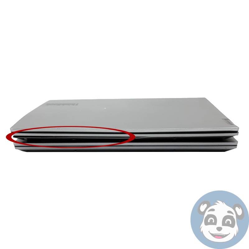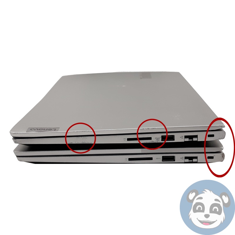 – One (1) laptop has cosmetic screen marks caused by the keyboard, a small crack and impact mark on the top right corner of the screen, and a bottom cover that does not fit properly with missing screws.