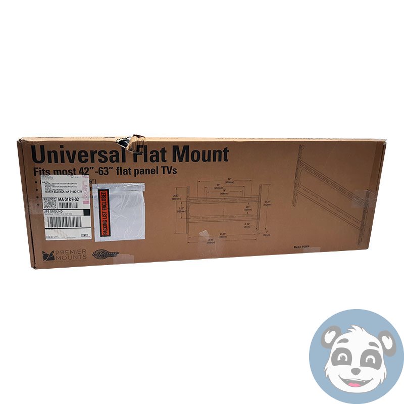 PREMIER P4263F Universal Flat Panel Mount, Submodel 9931-033-013-00, in brand new open box condition. This mount supports flat panel displays up to 175 lbs and comes in a black finish. The item has been checked and is complete, with screws sealed in the original factory bags. Packaging shows minor shelf wear, tears, or stains, as shown in the images.